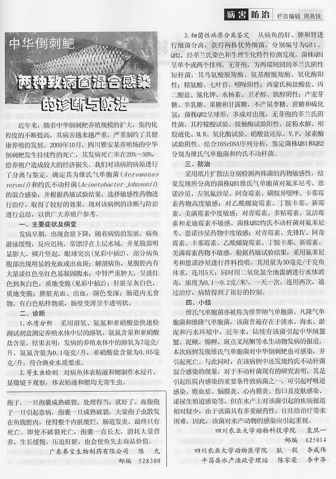 中華倒刺鲃兩種致病菌混合感染的診斷與防治