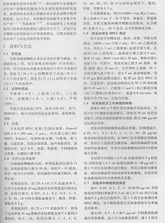 諾氟沙星在鯽體內(nèi)的藥動學(xué)及殘留研究2