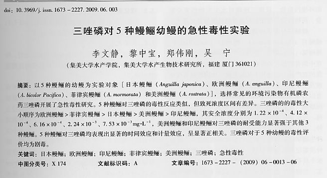三唑磷對5種鰻鱺幼鰻的急性毒性試驗