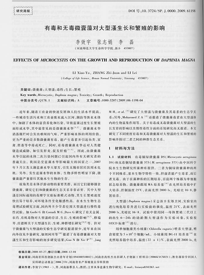 有毒和無毒微囊藻對大型溞生長和繁殖的影響1
