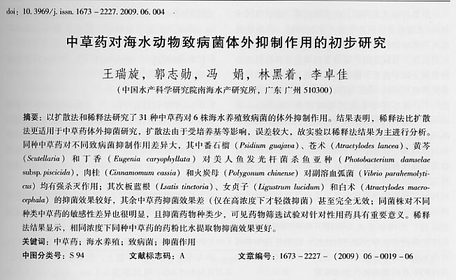 中草藥對(duì)海水動(dòng)物致病菌體外抑制作用的初步研究