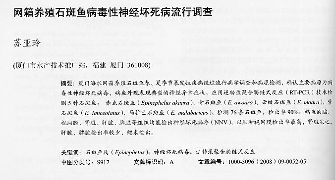 網(wǎng)箱養(yǎng)殖石斑魚病毒性神經(jīng)壞死病流行調(diào)查
