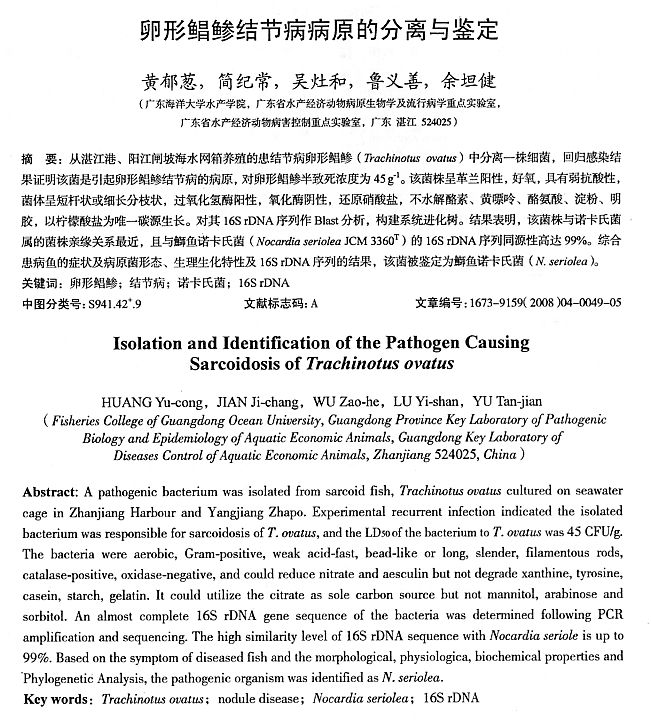 卵形鯧鲹結(jié)節(jié)病病原的分離與鑒定
