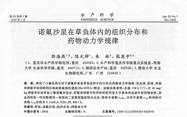 諾氟沙星在草魚體內(nèi)的組織分布和藥物動力學規(guī)律