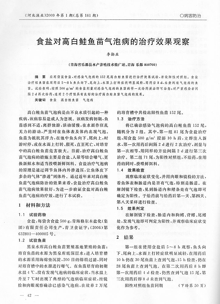 食鹽對高白鮭魚氣泡病的治療效果觀察1