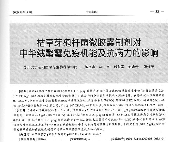 枯草芽孢桿菌微膠囊制劑對中華絨鰲蟹免疫機(jī)能及抗病力的影響
