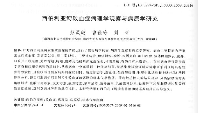 亞伯利亞鱘敗血癥病理學觀察與病原學研究