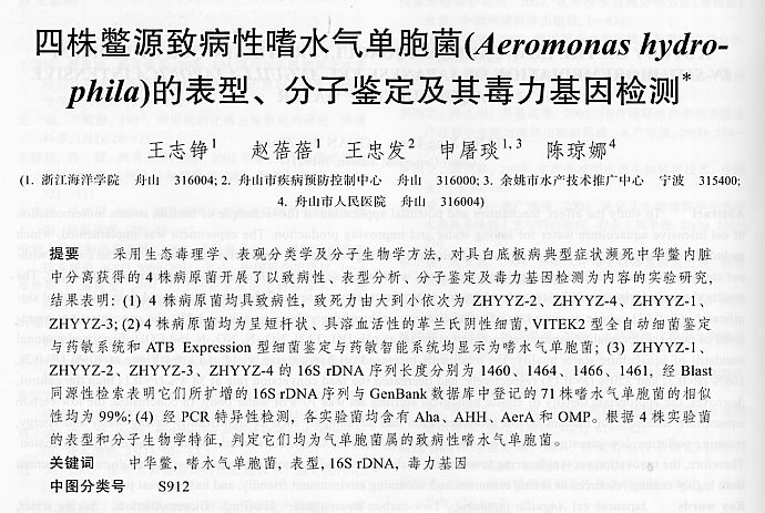 四株鱉源致病性嗜水氣單胞菌的表型、分子鑒定及其毒力基因檢測