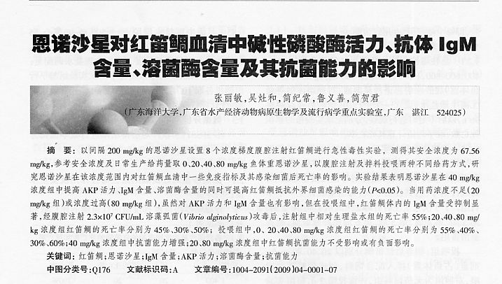 恩諾沙星對(duì)紅笛鯛血清中堿性磷酸酶活力、抗體lgM含量、溶菌酶含量及其抗菌能力的影響