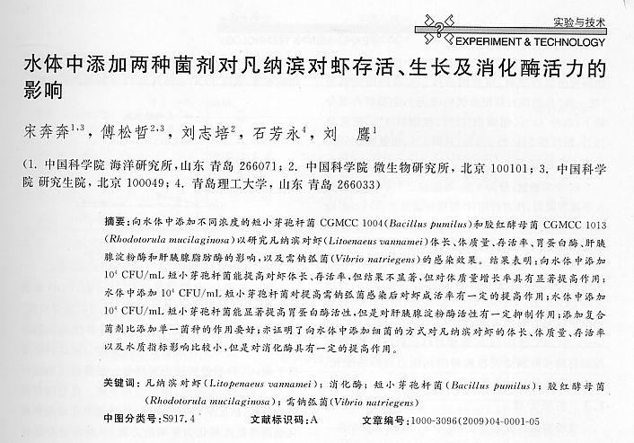 水體中添加兩種菌劑對凡納濱對蝦存活、生長及消化酶活力的影響