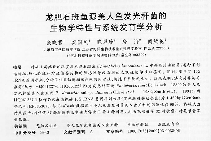 龍膽石斑魚源美人魚發(fā)光桿菌的生物學(xué)特性與系統(tǒng)發(fā)育學(xué)分析